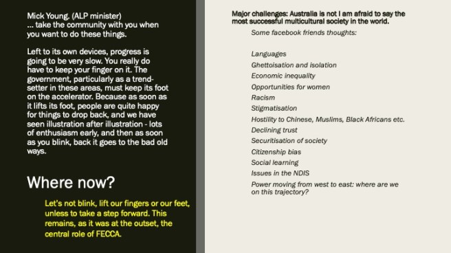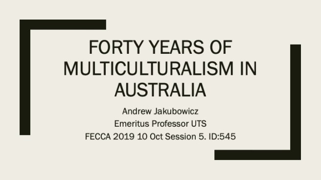In 1979 when FECCA was established I had just returned to Australia to become the Director of the Centre for Multicultural Studies at the University of Wollongong. From the outset I had a close relationship with FECCA and wish to acknowledge the founders and the staff who have sustained this organisation and its national networks over four decades.