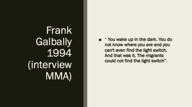 The man who had put the program together, Galbally, noted some years later (1994), that the situation he needed to address was confronting: “ You wake up in the dark. You do not know where you are and you can’t even find the light switch. And that was it. The migrants could not find the light switch”.